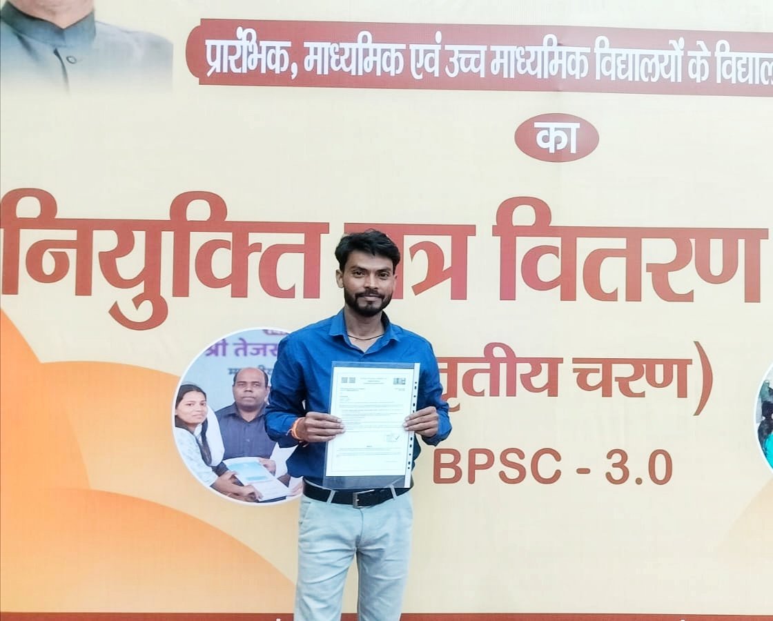 पलामू: प्रमंडलीय मुख्यालय मेदिनीनगर के रेड़मा, रांची रोड स्थित संगीत प्रशिक्षण केंद्र देवरानी संगीत महाविद्यालय से शिक्षा प्राप्त छात्र पंकज कुमार ने बिहार सरकार के द्वारा आयोजित उच्च माध्यमिक विद्यालय संगीत शिक्षक के पद पर नियुक्ति पत्र हासिल कर गौरवांवित किया. इस खुशी के मौके पर देवरानी संगीत महाविद्यालय के निदेशक नीरज कुमार मिश्रा और संगीत गुरु सूरज कुमार मिश्रा ने पंकज कुमार को बधाई और शुभकामनाएं दी है. उन्होंने जानकारी देते हुए कहा कि आज अगर उनके स्व. पिता पंडित राजाराम मिश्रा इस धरा पर जीवित होते तो इस गौरव के पल से अत्यंत गौरवांवित होते. उन्होंने कहा कि स्व. पिता पंडित राजा राम मिश्र ने देवरानी संगीत महाविद्यालय को अपने अथक परिश्रम और लगन से सींचा है उसी का प्रतिफल है कि पिछले 32 वर्षों से शहर में चल रहा इस संगीत महाविद्यालय से अब तक हज़ारों विद्यार्थियों ने संगीत की शिक्षा प्राप्त करके प्राइमरी स्कूल, मिडिल स्कूल, हाई स्कूल जैसे सरकारी और प्राइवेट क्षेत्रों के कई शिक्षण संस्थानों, व्यावसायिक क्षेत्रों में संगीत प्रशिक्षक और शिक्षिका के पद पर कार्यरत हैं और संगीत के क्षेत्रों में अपना नाम रोशन कर रहे हैं. सूरज मिश्रा ने जानकारी देते हुए कहा कि 2 वर्ष पूर्व भी 3 शिक्षा प्राप्त किये पूर्व विद्यार्थियों ने झारखंड सरकार हाईस्कूल संगीत शिक्षक नियुक्ति पत्र को हासिल किया था. विदित हो कि बिहार सरकार द्वारा 22 जुलाई 2024 को अध्यापक नियुक्ति प्रतियोगिता परीक्षा बीपीएससी टीआरई-03 आयोजित की गई थी. परीक्षा परिणाम 26 दिसम्बर 2024 को आया और प्रमाण पत्र सत्यापन 4 फरवरी 2025 को हुआ. जिसमें देवरानी संगीत महाविद्यालय के छात्र पंकज कुमार को उच्च माध्यमिक विद्यालय 10+2 जिला-गया, बिहार के लिए 9 मार्च 2025 को बिहार सरकार द्वारा संगीत शिक्षक के पद पर नियुक्ति पत्र प्रदान किया गया. इस सफलता के बाद पंकज ने कहा कि ये सब गुरुजी स्व. राजा राम मिश्र और माता-पिता के आशीर्वाद से संभव हुआ है. सर्वविदित है देवरानी संगीत महाविद्यालय प्रयाग संगीत समिति, इलाहाबाद से मान्यता प्राप्त पलामू जिले में एक मात्र संगीत महाविद्यालय है जहां से विद्यार्थी संगीत के गायन, वादन और नृत्य विधा में डिप्लोमा और डिग्री हासिल कर सकते हैं. देवरानी संगीत महाविद्यालय परिवार इस हर्ष के मौके पर वर्तमान में शिक्षा प्राप्त कर रहे सभी विद्यार्थियों को उनके उज्जवल संगीत भविष्य के लिए शुभकामनाएं देते हुए कहा कि देवरानी संगीत महाविद्यालय विद्यार्थियों को बेहतर उच्च गुणवत्तापूर्ण शास्त्रीय और सुगम संगीत शिक्षा प्रदान करने के लिए निरंतर प्रयासरत है,जिससे संगीत विद्यार्थी संगीत के क्षेत्र में अपना सर्वश्रेष्ठ प्रदर्शन कर सकें.