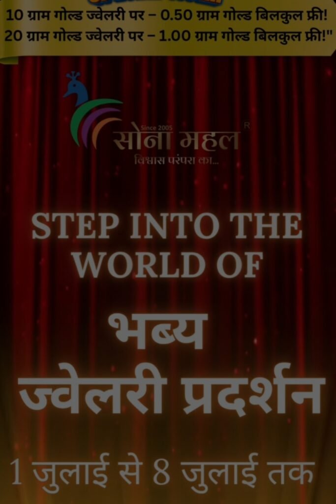 उसी के फल स्वरुप पांडे कंपलेक्स थाना रोड स्थित सोना महल में 5 जुलाई से 20 जुलाई तक भव्य ज्वेलरी प्रदर्शनी रखी गई है, जिसमें मुंबई, दिल्ली राजकोट, अहमदाबाद, दुबई तक के सोने,चांदी एवं हीरे के गहने उपलब्ध होंगे। उन्होंने बताया कि प्रत्येक 10 ग्राम सोने की खरीदारी पर ग्राहकों को 0.500 मिली ग्राम सोना एवं प्रत्येक 20 ग्राम सोने की खरीदारी पर 1 ग्राम सोना ग्राहकों को मुफ्त में उपलब्ध होगी।